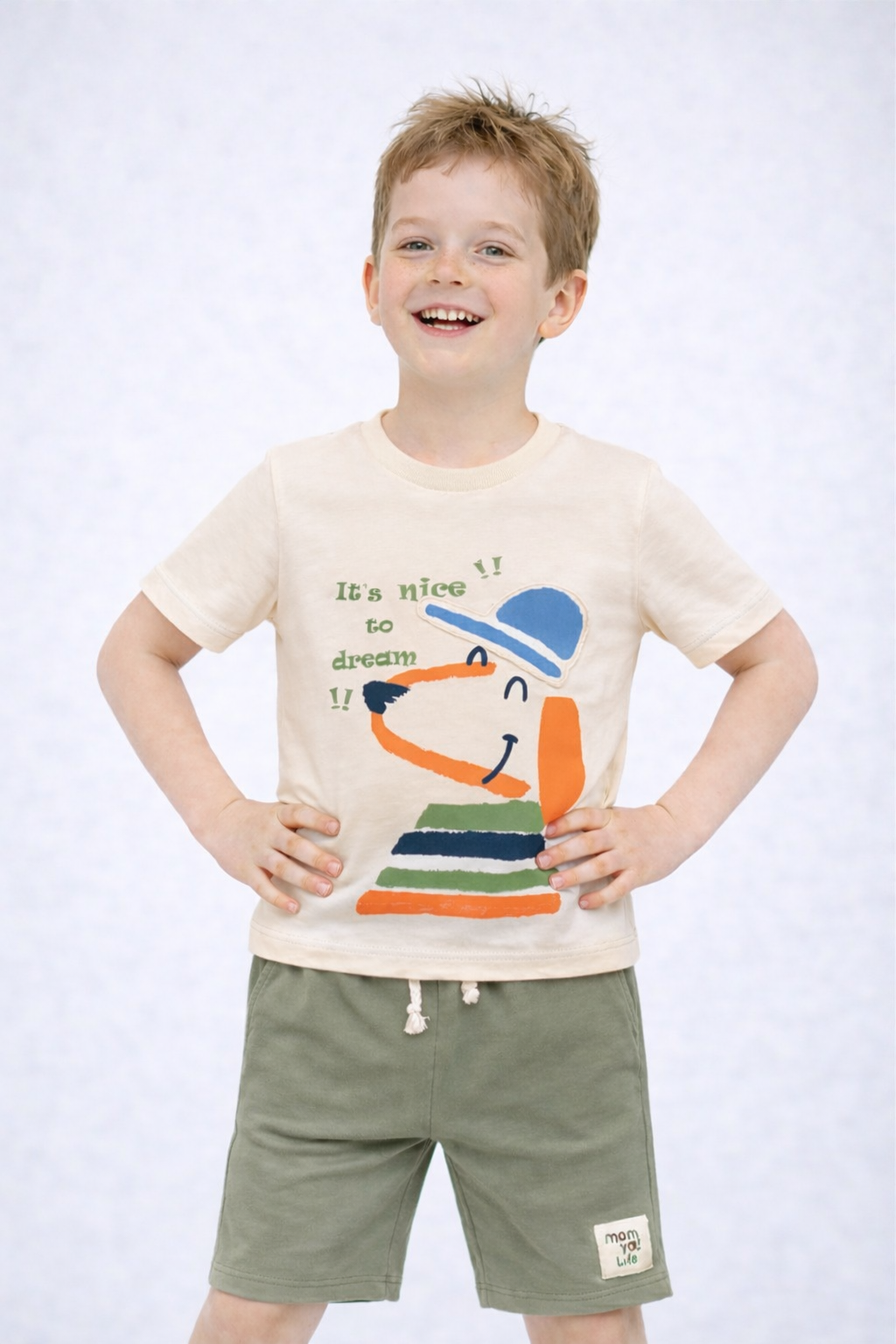 Καλοκαιρινό σετ για αγόρι με σκυλάκι, με βαμβακερό ύφασμα ιδανικό για παιχνίδι και καθημερινές δραστηριότητες.