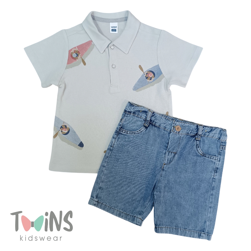 Καλοκαιρινό βαμβακερό σετ για αγόρι. Περιλαμβάνει γκρι μπλούζα με σχέδια βάρκες και τζιν σορτσάκι με κουμπί. Άνετη εφαρμογή.