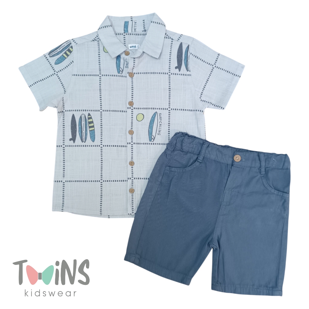 Καλοκαιρινό σετ για αγόρι. Περιλαμβάνει γκρι πουκάμισο με σχέδια και μπλε σορτσάκι από σταθερό ύφασμα. Το σορτσάκι έχει εσωτερικό λάστιχο για καλύτερη εφαρμογή.